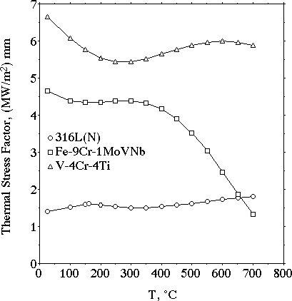 Comparison of the thermal stress factor, TSF = (3Sm)/{[alpha]m E [k (1Ð[nu])]^-1}, for 316L(N), Fe-9Cr-1MoVNb and V-4Cr-4Ti.