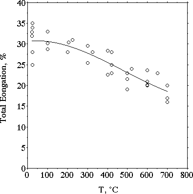 Total elongation (TE) data and best-fit correlation for unirradiated vanadium alloys with 4-5 wt.% Cr, 3-5 wt.% Ti and 0.05 +/- 0.04 wt.% Si. The best fit correlation is recommended to represent the average TE for V-4Cr-4Ti.