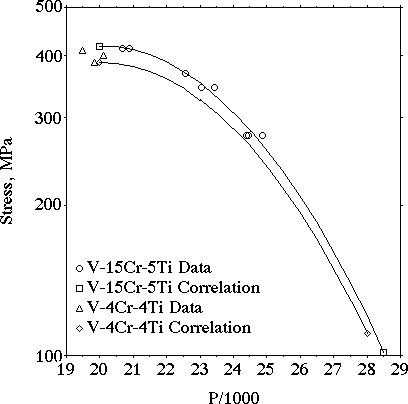 Rupture stress vs. the Larsen Miller Parameter [P = T (20 + log tr), where T is temperature in K and tr is rupture time in hours] for V-15Cr-5Ti and V-4Cr-4Ti. The correlation for V-4Cr-4Ti is based on the form of the correlation for V-15Cr-5Ti.